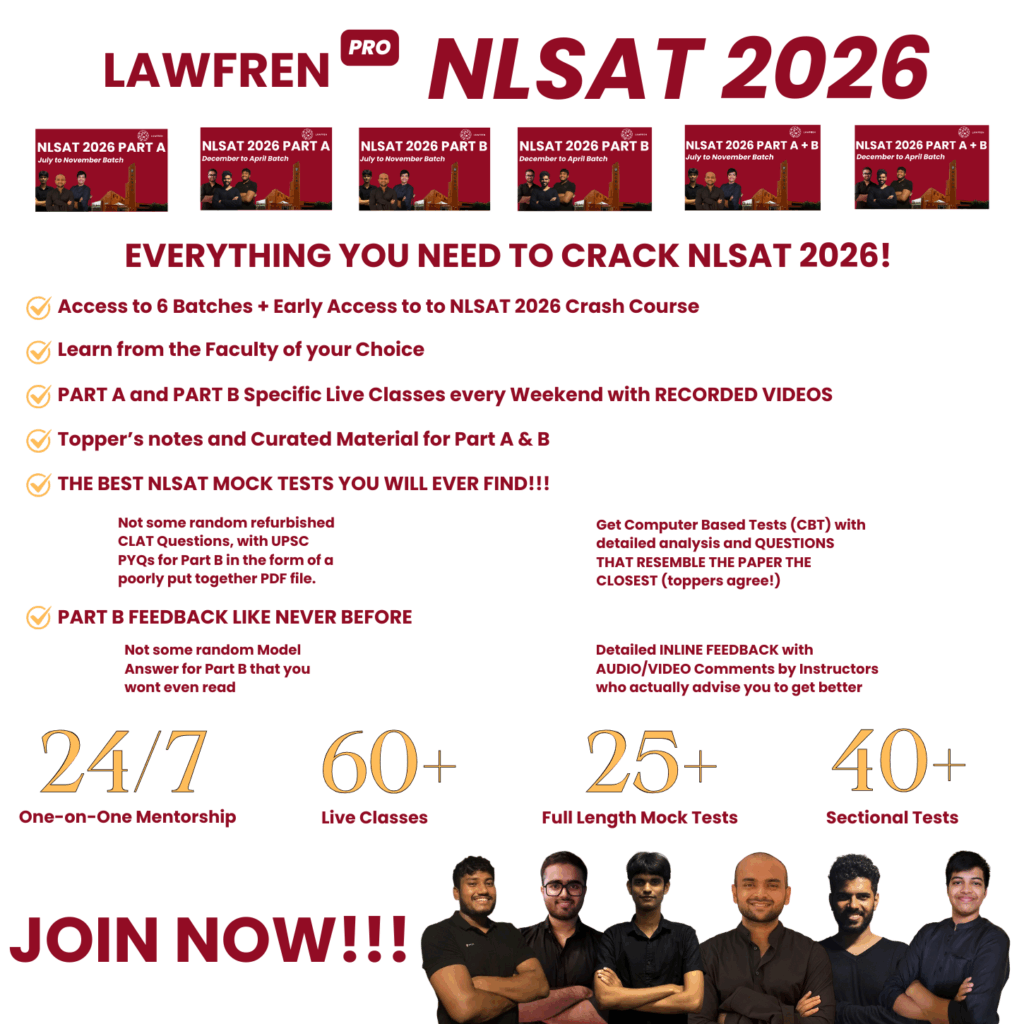 Lawfren Pro NLSAT 2026 is not just a course – it’s your all-in-one preparation companion for cracking India’s most prestigious 3-Year LL.B. entrance – NLSAT by NLSIU Bangalore. With this 1-year subscription, you unlock everything Lawfren offers from the day of purchase till NLSAT 2026 – across all batches, courses, mocks, and updates.